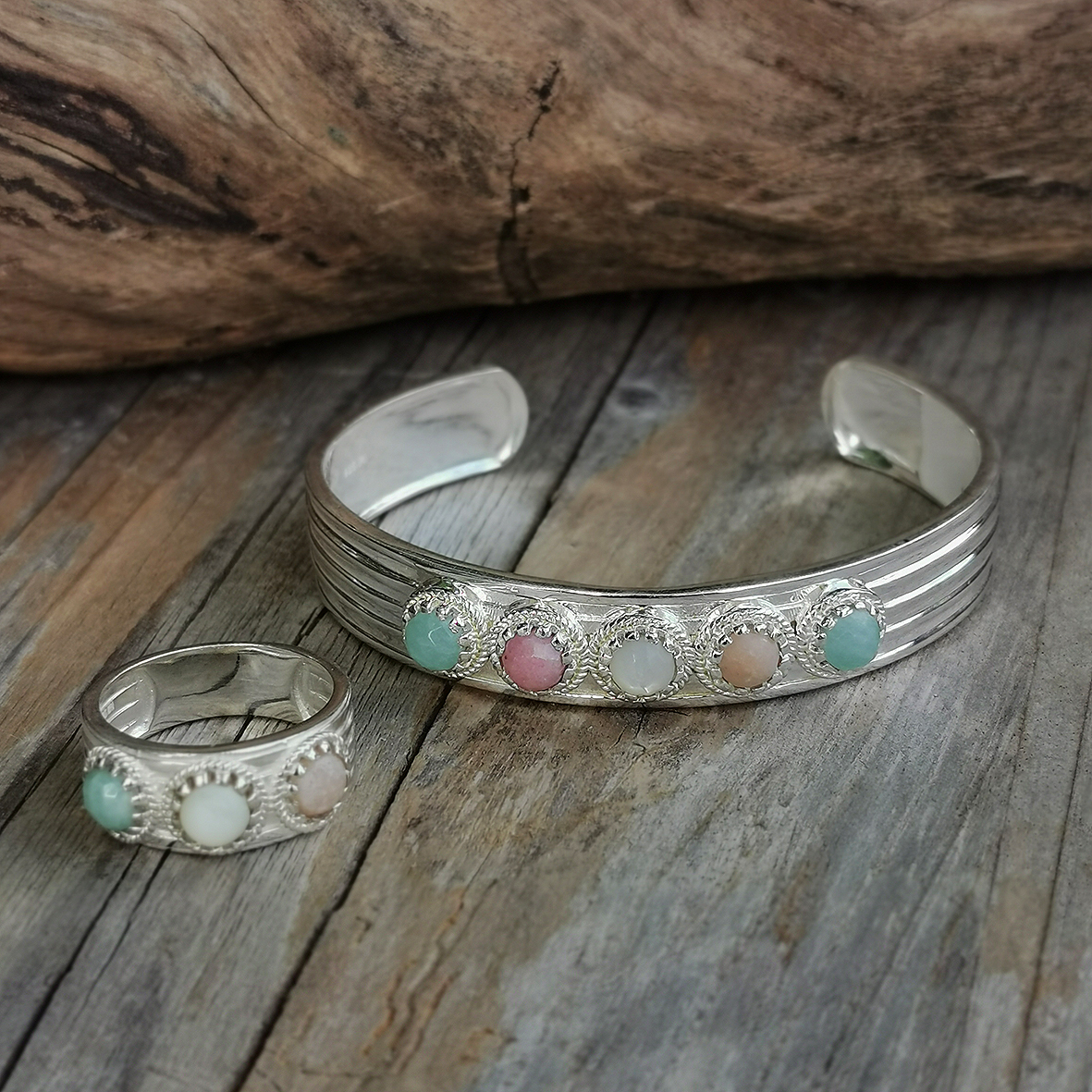 Armreif mit Edelsteinen in Pastellfarben Pfirsich-Aventurin, Amazonit, Muschel Silber 925 von Argento Furioso offen, Grösse verstellbar Breite 1.1 cm