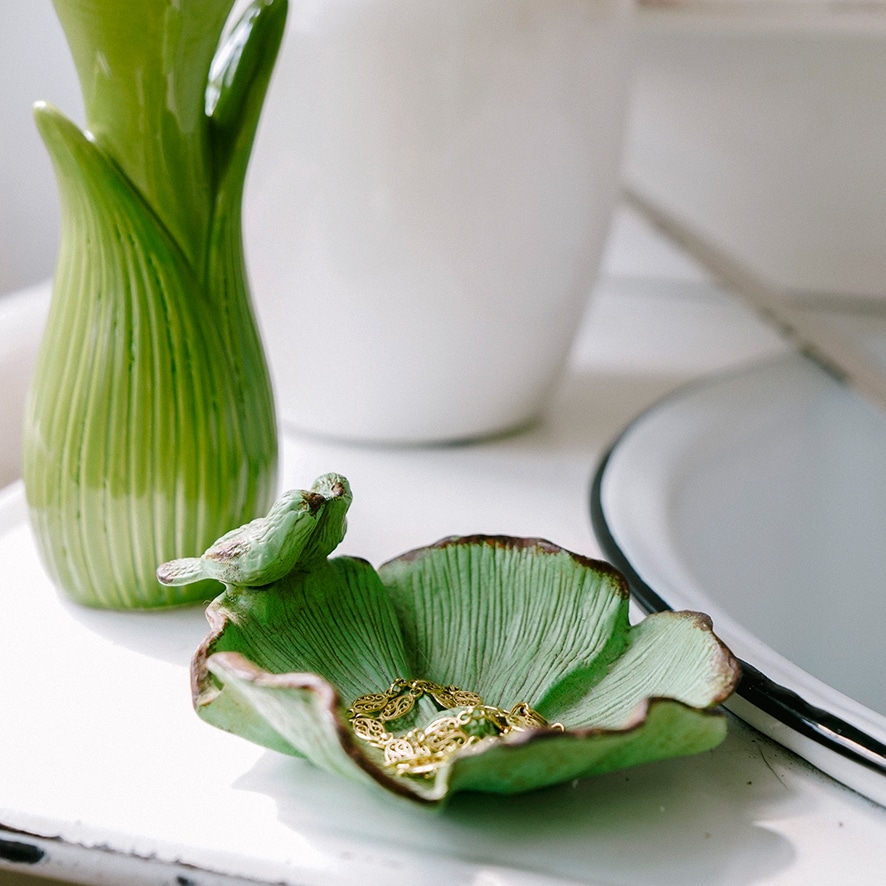 Schale in Form einer Blüte mit kleinen Vögeln, die auf dem Rand sitzen für Schmuck oder Deko Material: Metall Masse: 10 x 4 cm Farbe: Mintgrün