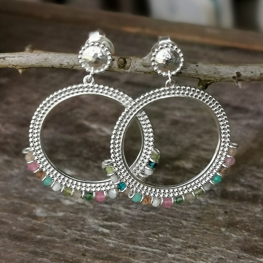 grosse runde Ohranhänger mit vielen geschliffenen Edelsteinen Silber 925 von Argento Furioso Durchmesser 3.5 cm Länge 4.5 cm