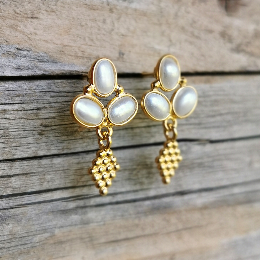 Ohrstecker mit drei ovalen Perlen und Anhänger Raute gepunktet Gold Silber vergoldet von Argento Furioso Grösse einzelne Perle: 5 x 7 mm Gesamtlänge: 2.5 cm