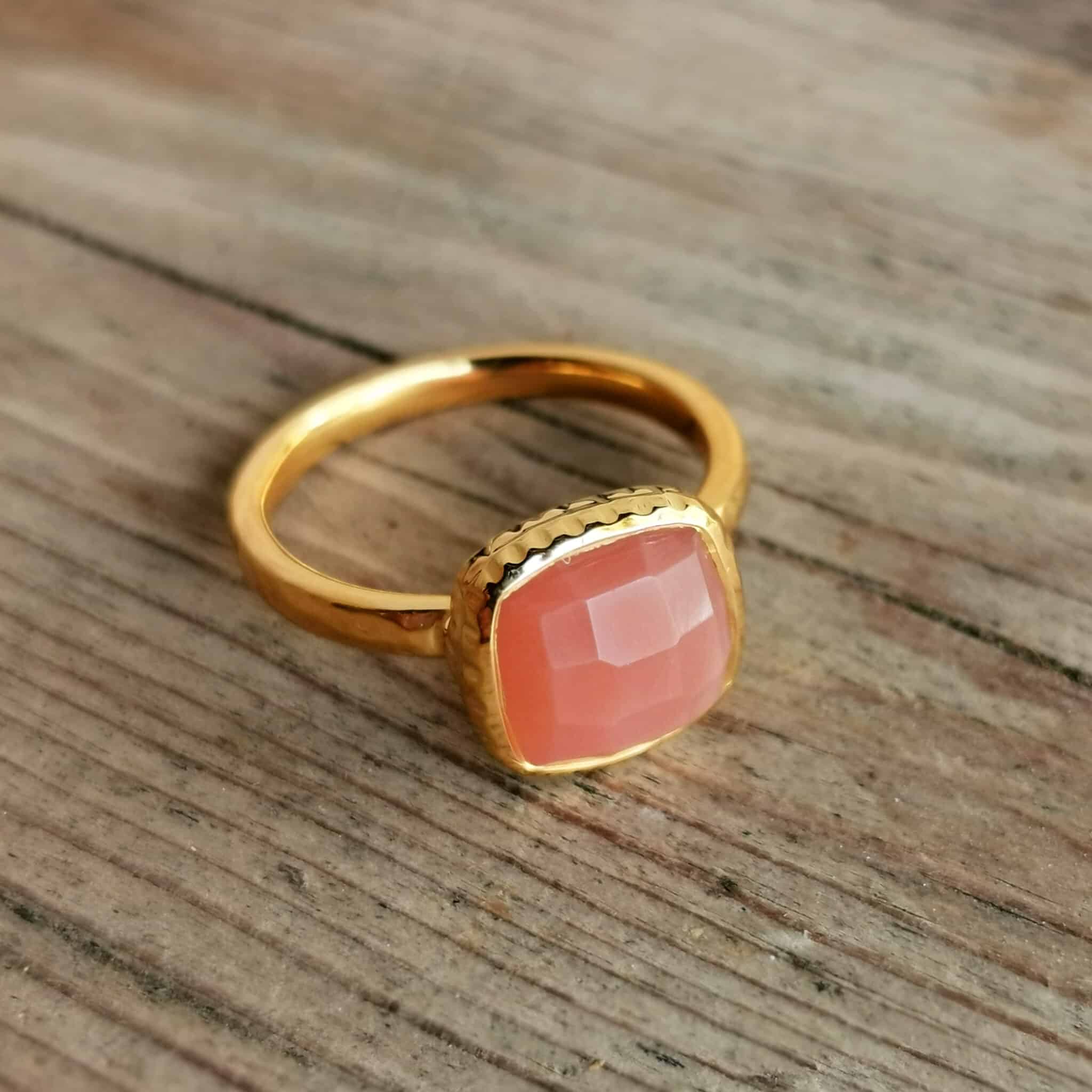 Ring mit quadratischem, geschliffenem Stein Silber vergoldet von Argento Furioso erhätlich mit Rosenquarz (Grösse 54), Labradorit (grau-blau-grün, Grösse 52), Pfirsich-Mondstein (Grösse 58), blauer Quarz (Grösse 58), rosa Achat (Grösse 58)