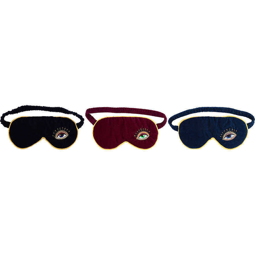 Schlafmaske aus Samt mit Perlen bestickt für angenehmen Tragekomfort mit einem (zwinkernden) Auge erhältlich in Blau, Grün oder Rot optimale Lichtblockierung für erholsamen Schlaf 20 x 10 cm