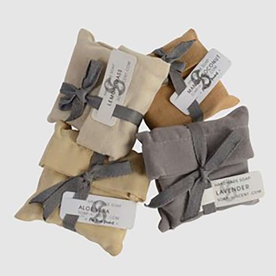 Seife handgefertigt im Baumwollbeutel mit Naturfarben Grösse 6 x 7 x 2.5 cm, 100 g erhältlich mit den Inhaltsstoffen Mango & Kokosnuss, Zitronengras, Lavendel und Aloe Vera