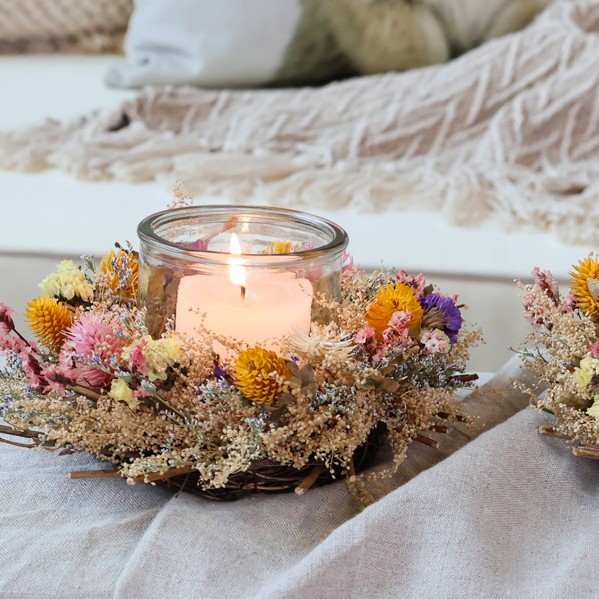 Windlicht in Herbstfarben mit Kranz aus echten, getrockneten Blumen Windlicht aus Glas, Unterlage Metall Höhe 8.5 cm, Durchmesser 15 cm
